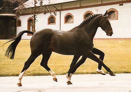 Pik Bube I was 2nd in 100-day test at Adelheidsdorf. Otto Schulte-Frohlinde acquired Pik Bube I at Gronwoldhof in the 1970s as a foundation sire and Pik Bube I he transformed Gronwoldhof to a pilgrimage centre for breeders. The powerful paces of this dark tan stallion matured to a dressage horse par excellence under Herbert Rebhein winning 11 of the 12 advanced dressage test competitions he competed in. As he was in such a great demand at stud, there was almost no chance to continue his career in dressage.